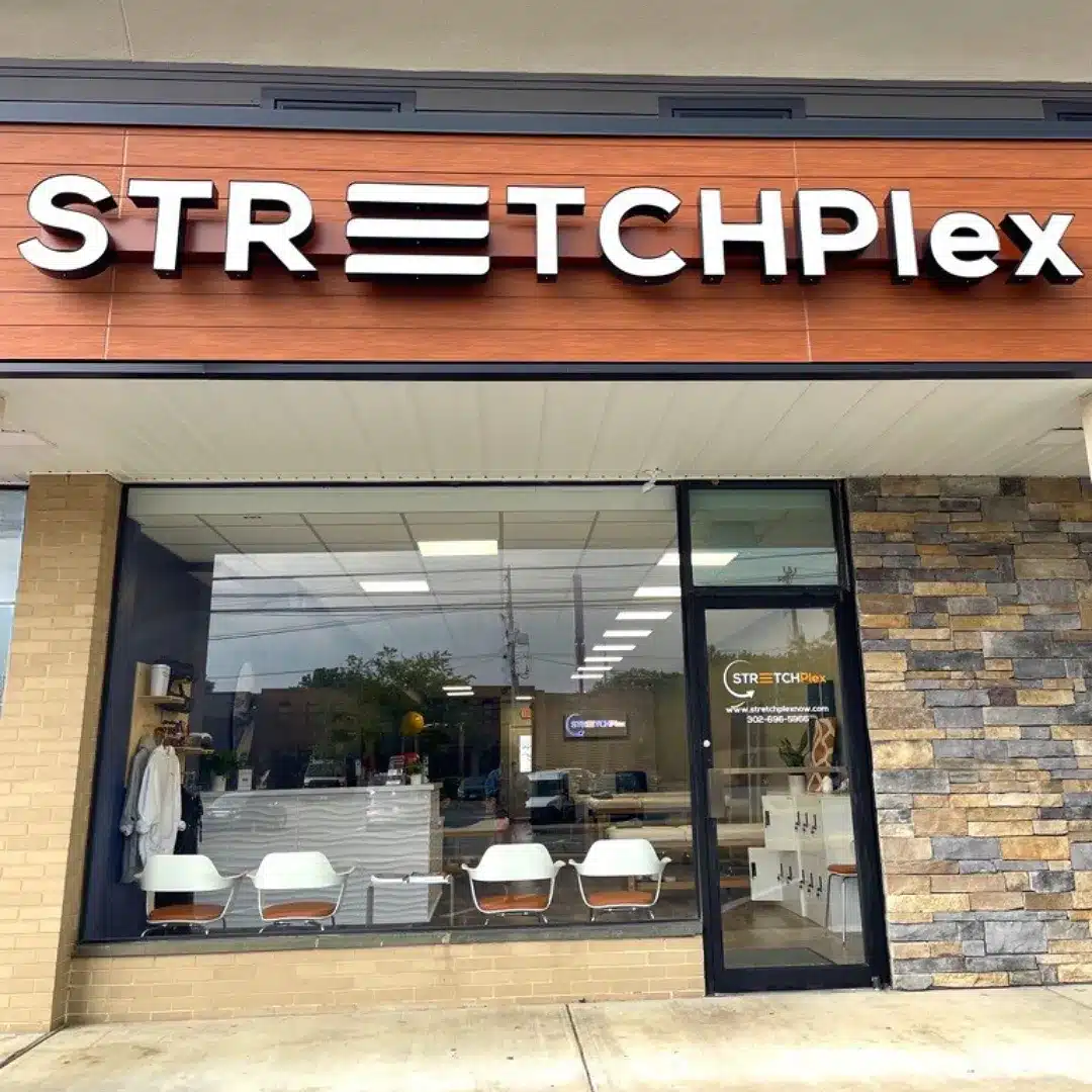 two women smiling with arms up in front of “STRETCHplex Wellness You Can Feel” sign